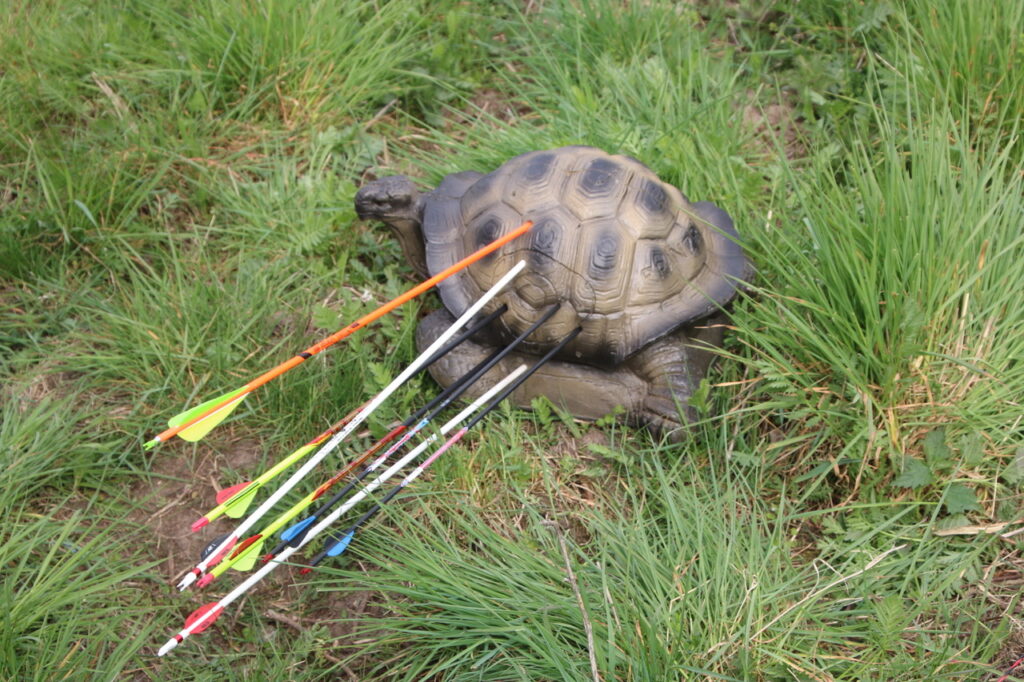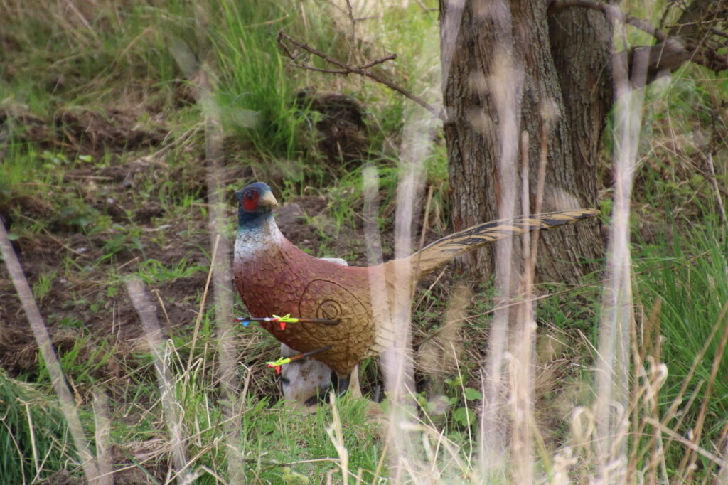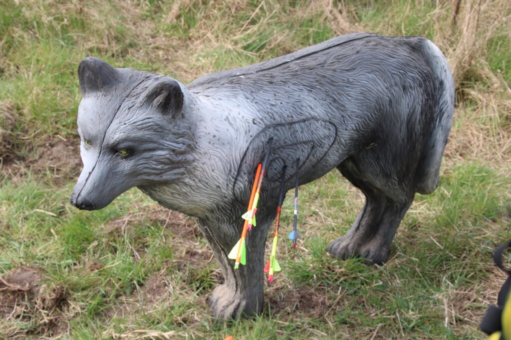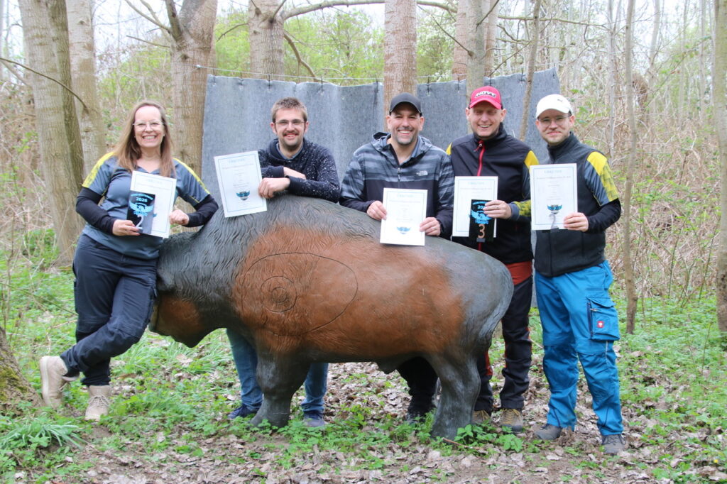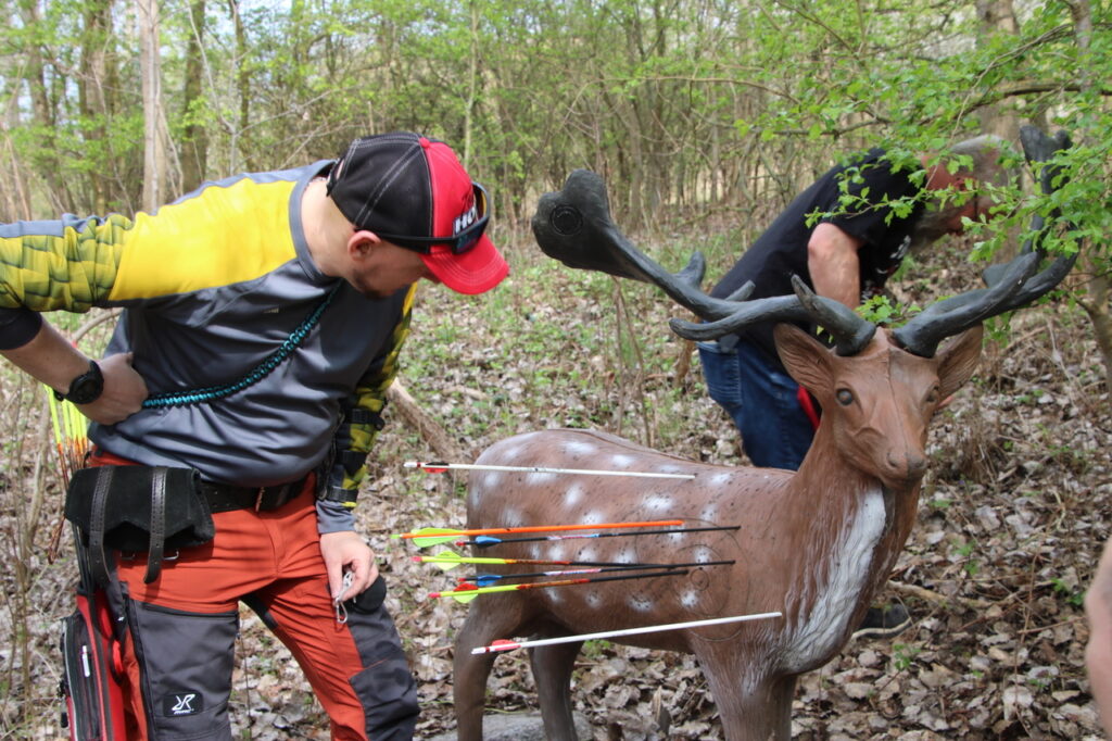 Nach einem standesgemäßen gemeinsamen Frühstück ging es hochmotiviert zum Schießgelände. Dort wartete schon die erste Herausforderung: warm machen, bevor man sich einschießt. Anschließend starteten wir in eine Doppelhunter-Runde – sprich: zwei Pfeile pro Ziel, 18 Ziele insgesamt. Und was soll man sagen: Die Ziele waren nicht nur liebevoll gestellt, sondern auch so platziert, dass das Gelände wirklich alles von uns verlangte – bergauf, bergab und zwischendurch auch mal „wo zur Hölle steht das Ziel eigentlich?“.